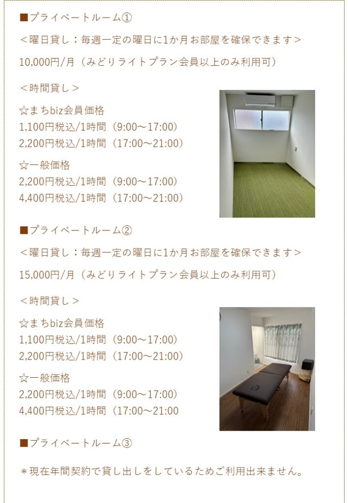 | プライベートルーム 曜日貸し (非会員は利用不可) | ①:10,000円税込 / 月 ②:15,000円税込 / 月 | ①:10,000円税込 / 月 ②:15,000円税込 / 月 | (利用不可) |